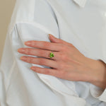 トリリアントカットのペリドットは格別の輝きを放ち、遠くからでも思わず目を奪われる美しさ。雲のようにもこもことしたアームデザインが、愛らしいニュアンスを添えています。