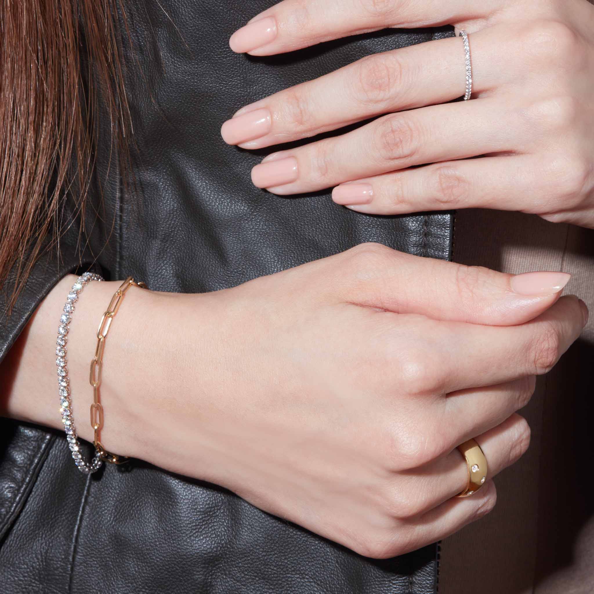 リズミカルに並ぶダイヤモンドが、指の動きに合わせて軽やかに光を放ちます。丸みを帯びたフォルムとボリューム感が、スタイルにモダンな存在感を添えるジュエリー。